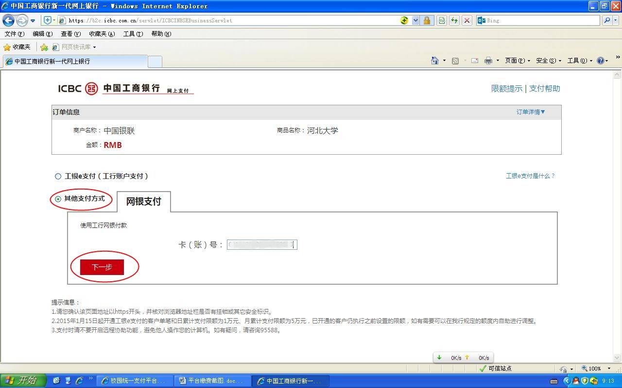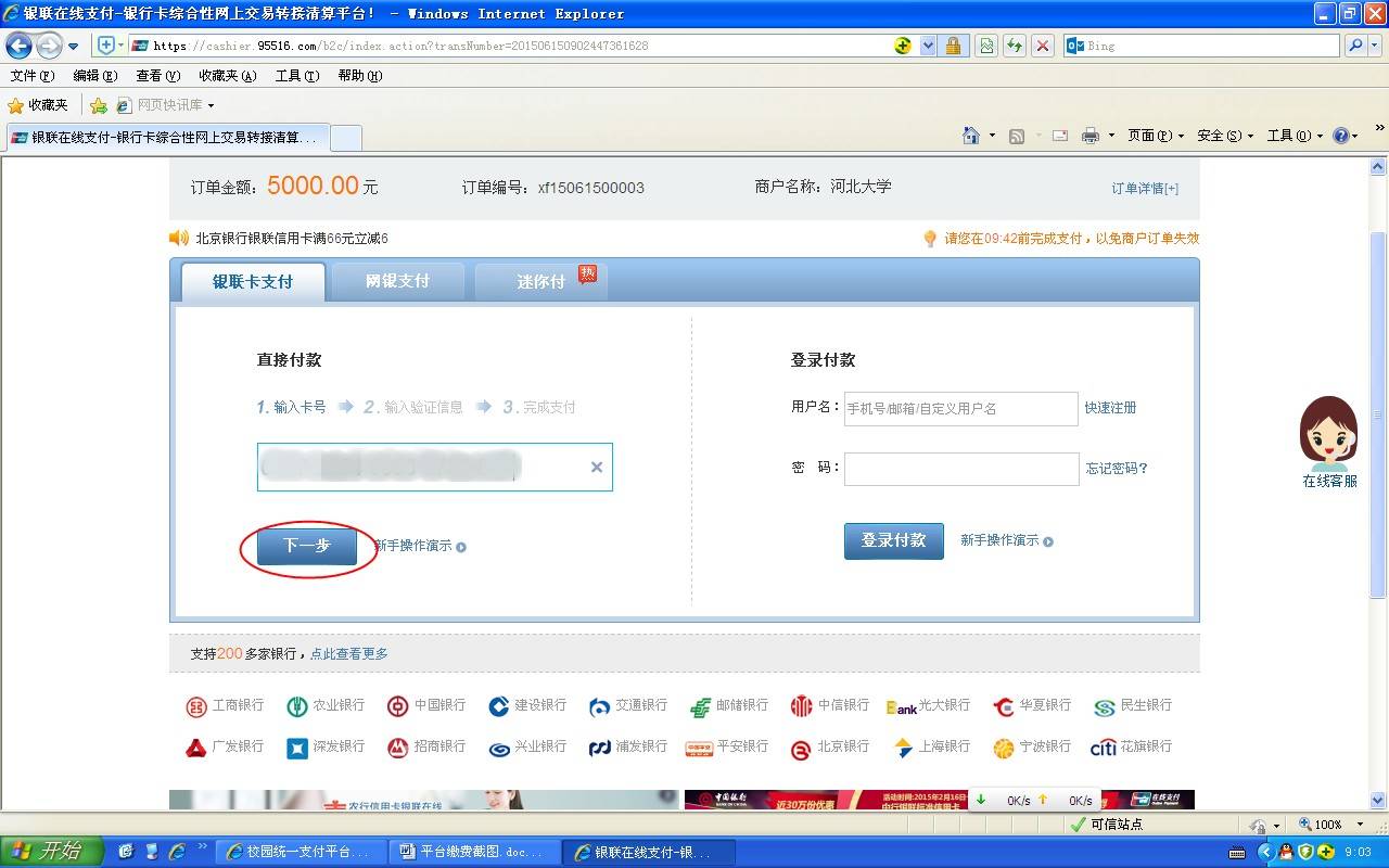 8、缴费平台目前开通的支付方式是银联在线支付和网银支付,一般选择使用银联在线支付,大额支付使用网银支付。选择“银联卡支付”,输入银联卡号,核对准确无误后,点击“下一步”。