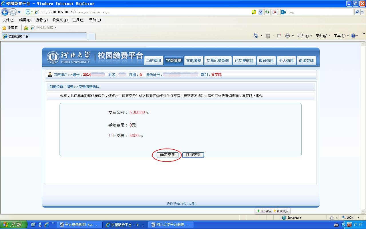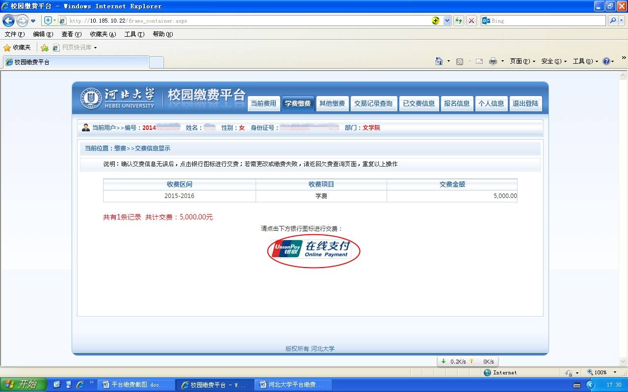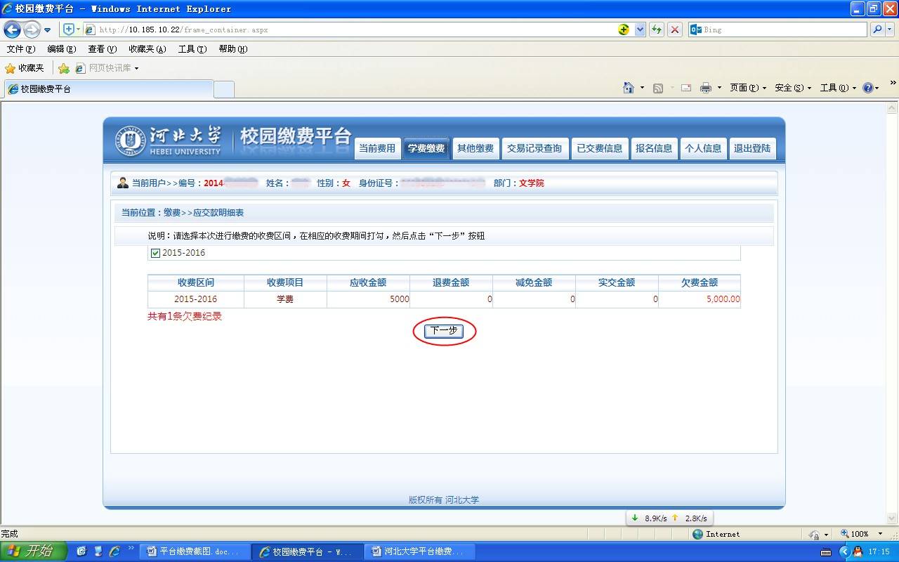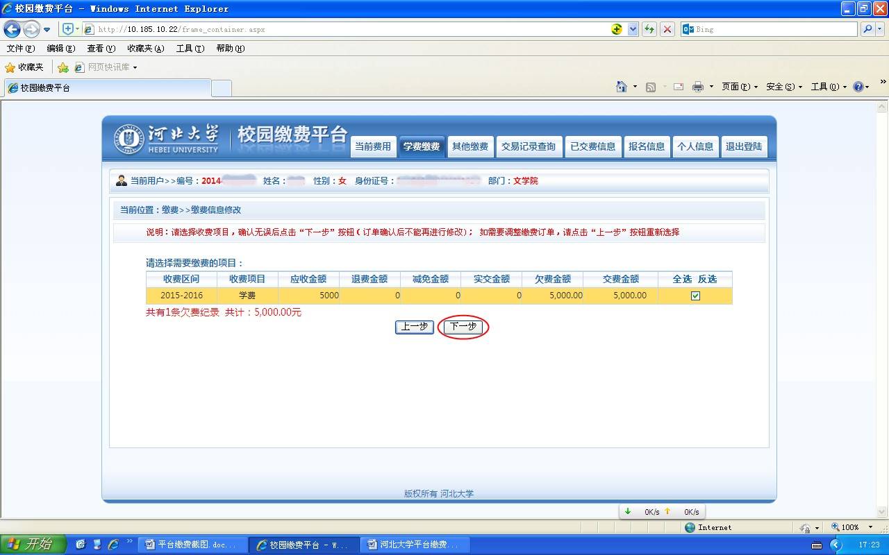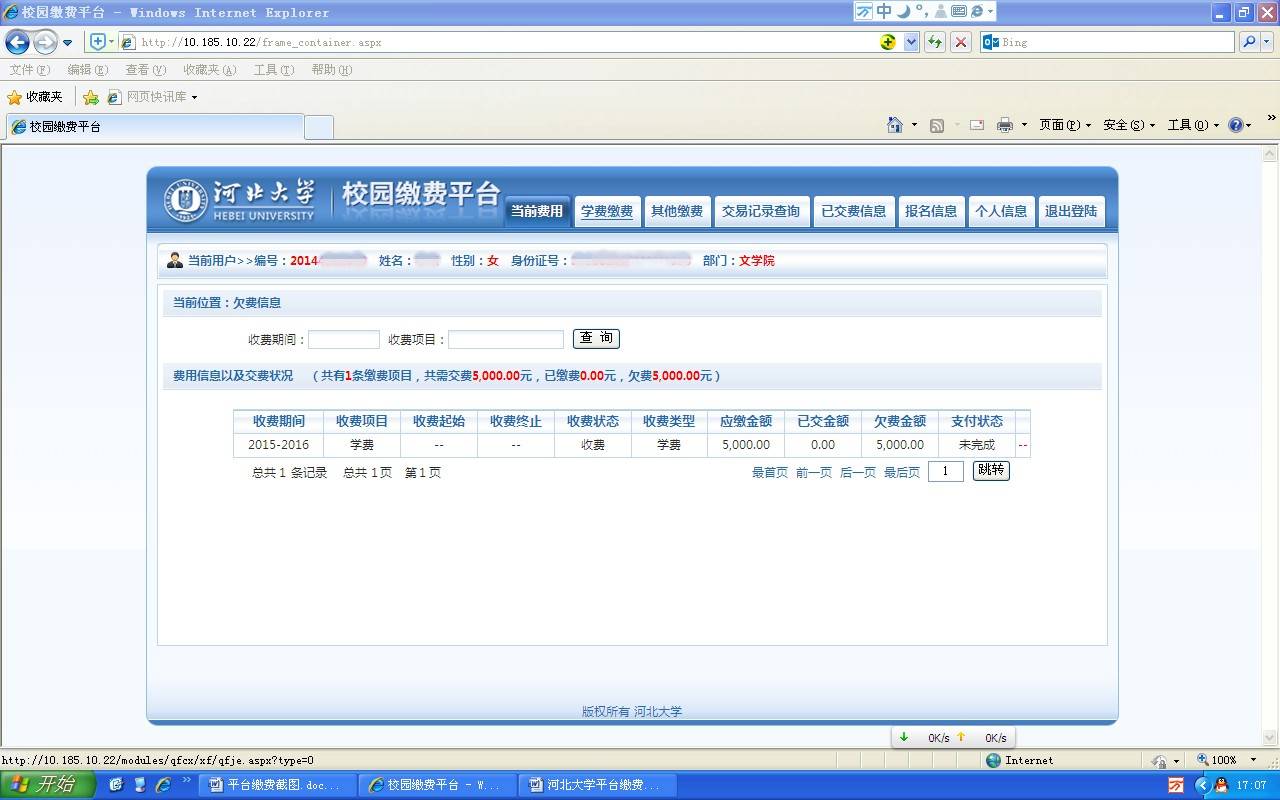 3、进入河北大学校园缴费平台,显示学生相关信息及所有欠费信息。