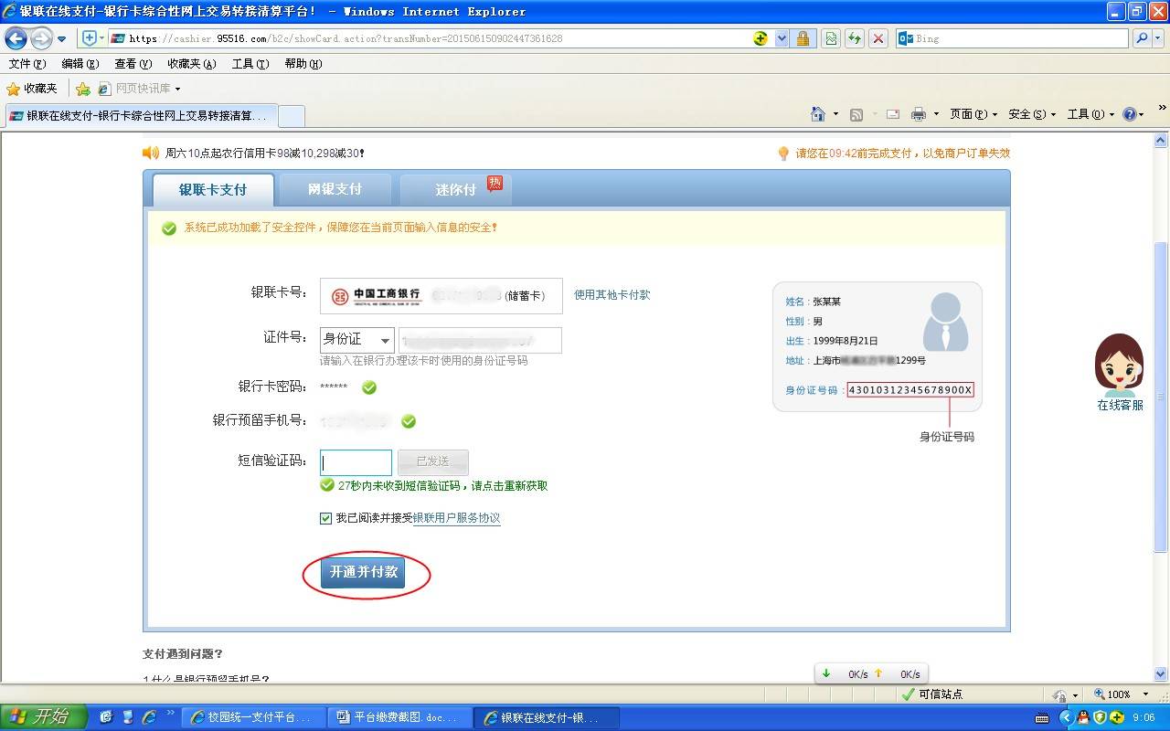 10、显示该银联卡在银行预留的信息,正确输入相关信息,并输入免费获取的短信验证码,点击“开通并付款”。