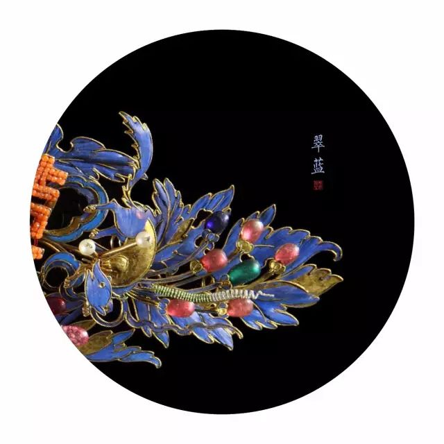 (点翠镶料石松鼠葡萄双喜纹头花 局部)