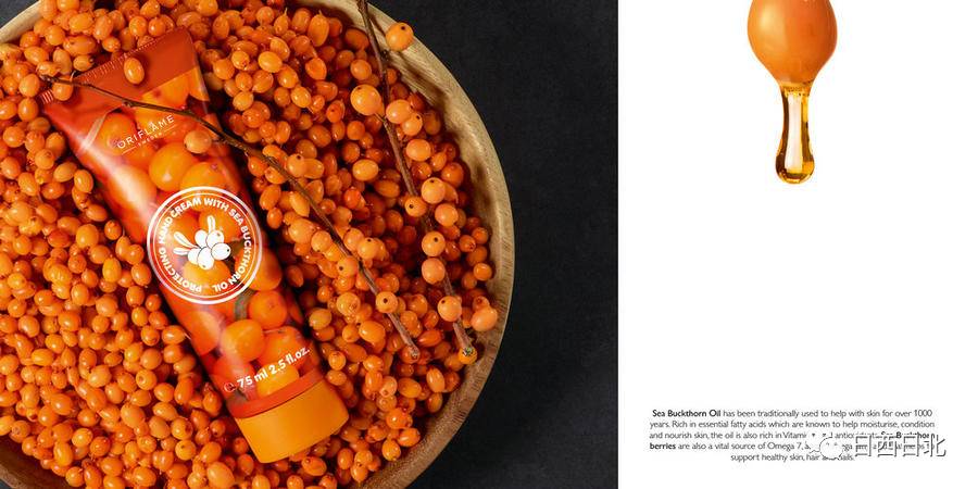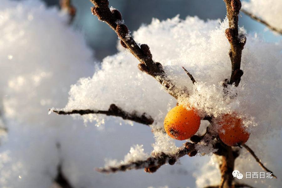 小小的沙棘果,通体呈现亮丽的橘红色,皮薄而汁水丰富,因为和蓝莓、奇异莓同属一个小浆果科而外形极为相似。