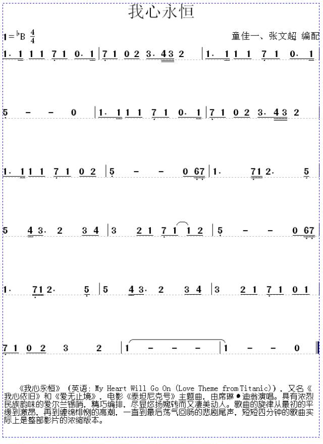 《我心永恒》属于流行音乐风格,具有浓烈民族韵味的爱尔兰锡哨和风笛尽显悠扬婉转而又凄美动人。歌曲的旋律从最初的平缓到激昂,再到缠绵悱恻的高潮,一直到最后荡气回肠的悲剧尾声,短短四分钟的歌曲实际上是整部影片的浓缩版本。
