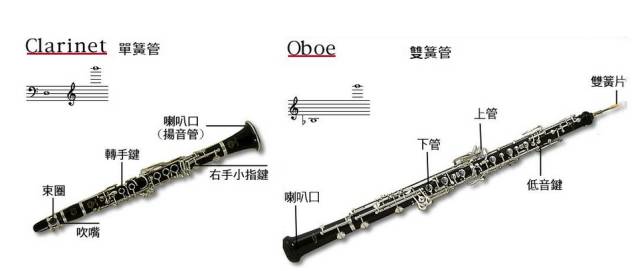 【单簧管】音色圆润富丽,是木管组最富有表情性的乐器,它的渐强渐弱控制自如,可和弓弦乐器媲美。它的低音区音色丰厚,常表现出庄严、阴沉,哀愁或凶险的戏剧性效果;中音区音色柔和、含蓄;高音区明亮有力,善于表现喜悦激情乐句;最高音区尖锐、粗野。