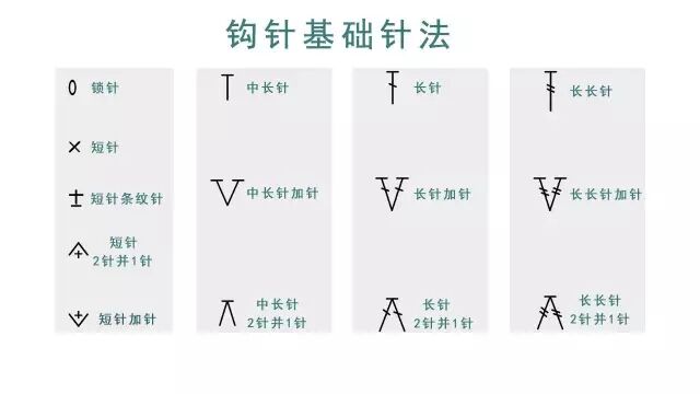 视频中的钩织基础针法图,在下方展示,方便之后看图解时对照理解。
