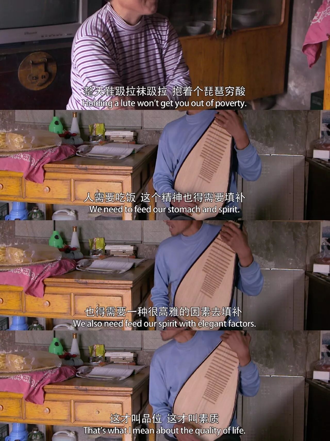 杜深忠坐在旧茶几边上拉着破旧的二胡,不禁感慨:“其实对这个二胡我没多少兴趣,我真正喜欢的是琵琶,不管是电视里还是其它,听到琵琶动静我心里特别舒服。假如有可能,以后有条件的话,咱弄张琵琶玩玩我觉得。”