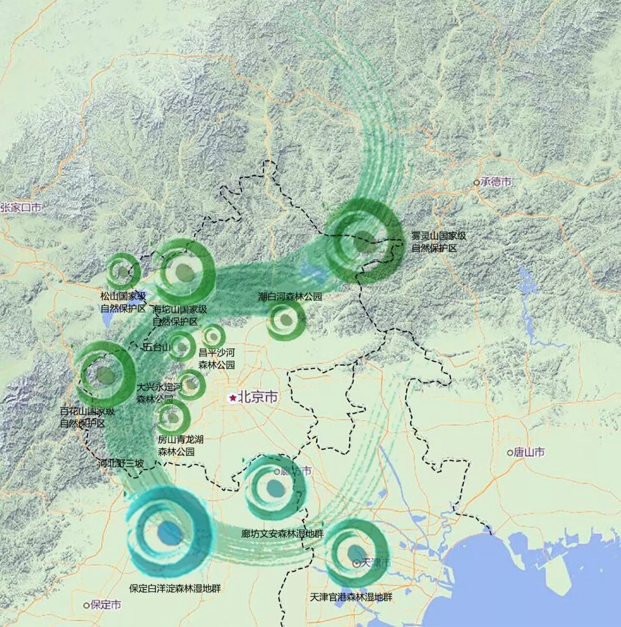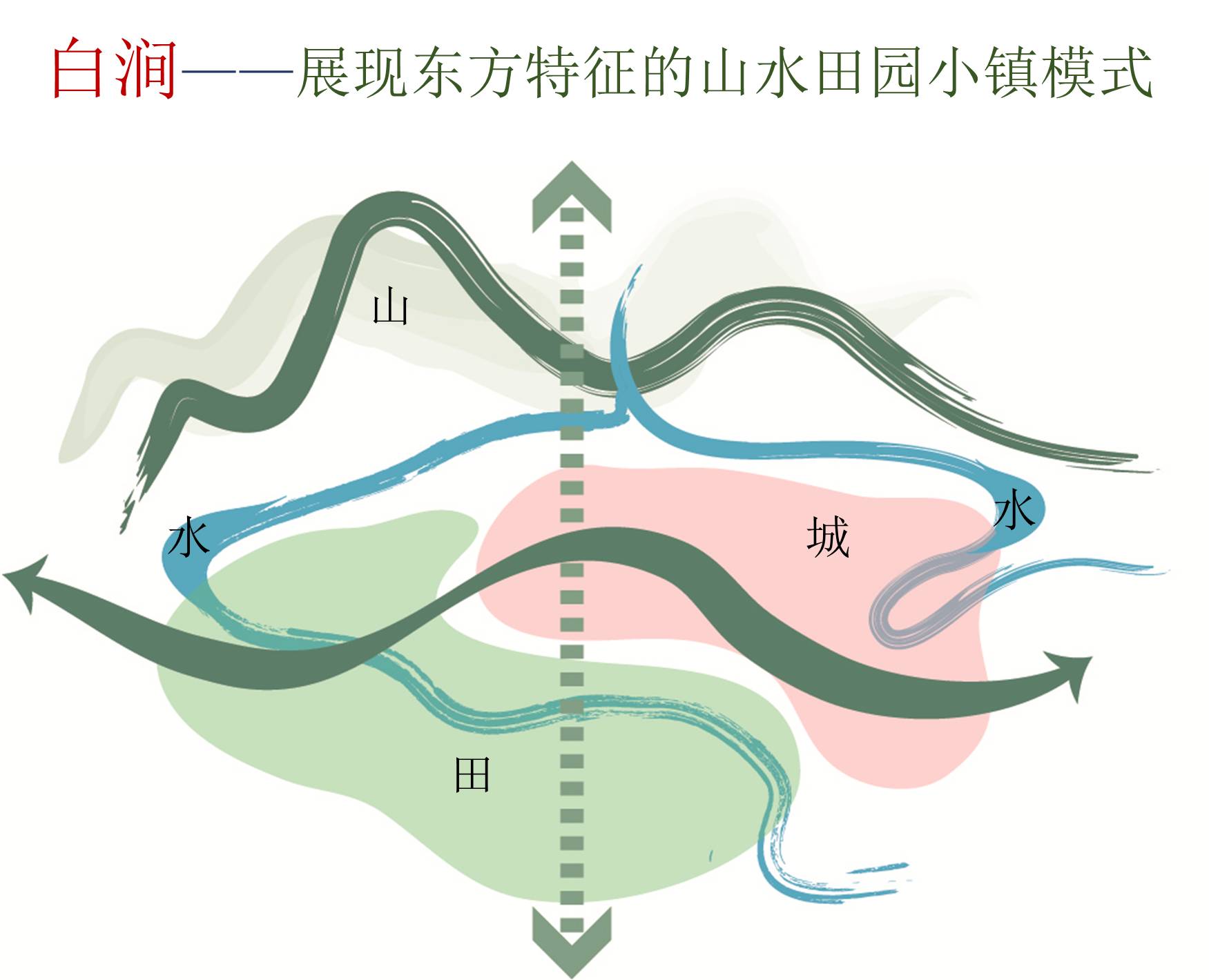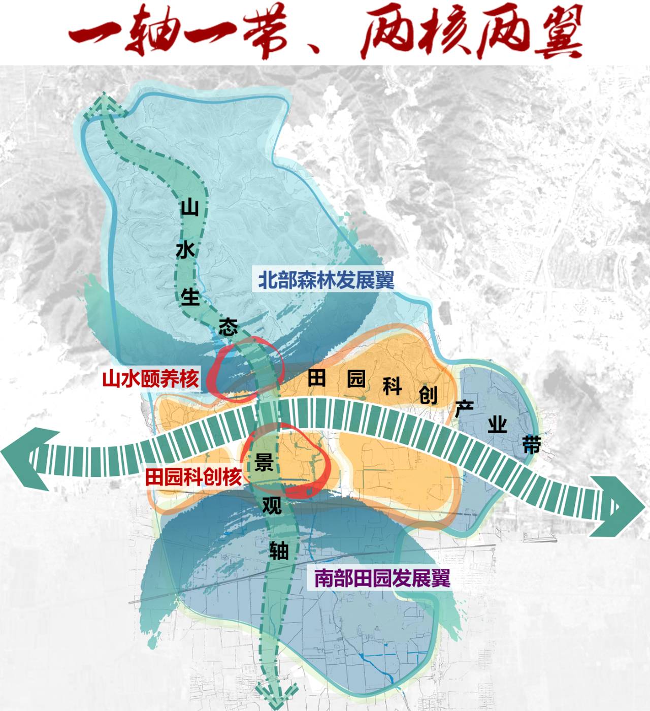 国家公园体制作为近年来重要的国家战略之一,北京周边“环首都国家公园环”方位和类型尚有缺口,蓟州白涧镇填补空白建设国家农业公园正当其时。设计团队针对未来农业发展融合化、绿色化、一体化等趋势,采取“三区三核、一轴一带”的规划理念,力求形成集农业科技研发推广、绿色生产、休闲度假、生态人居为一体的绿色城镇化典范。