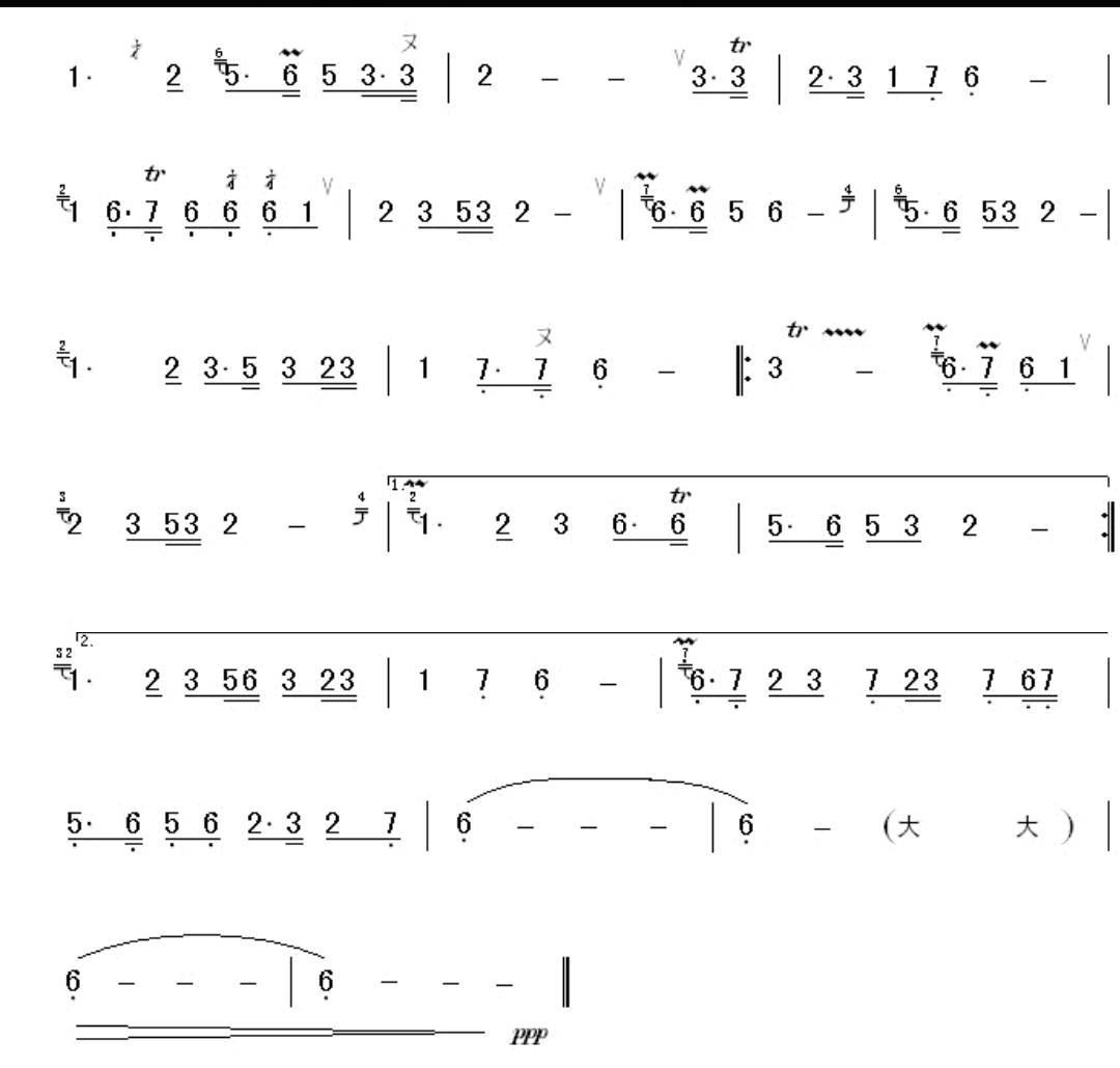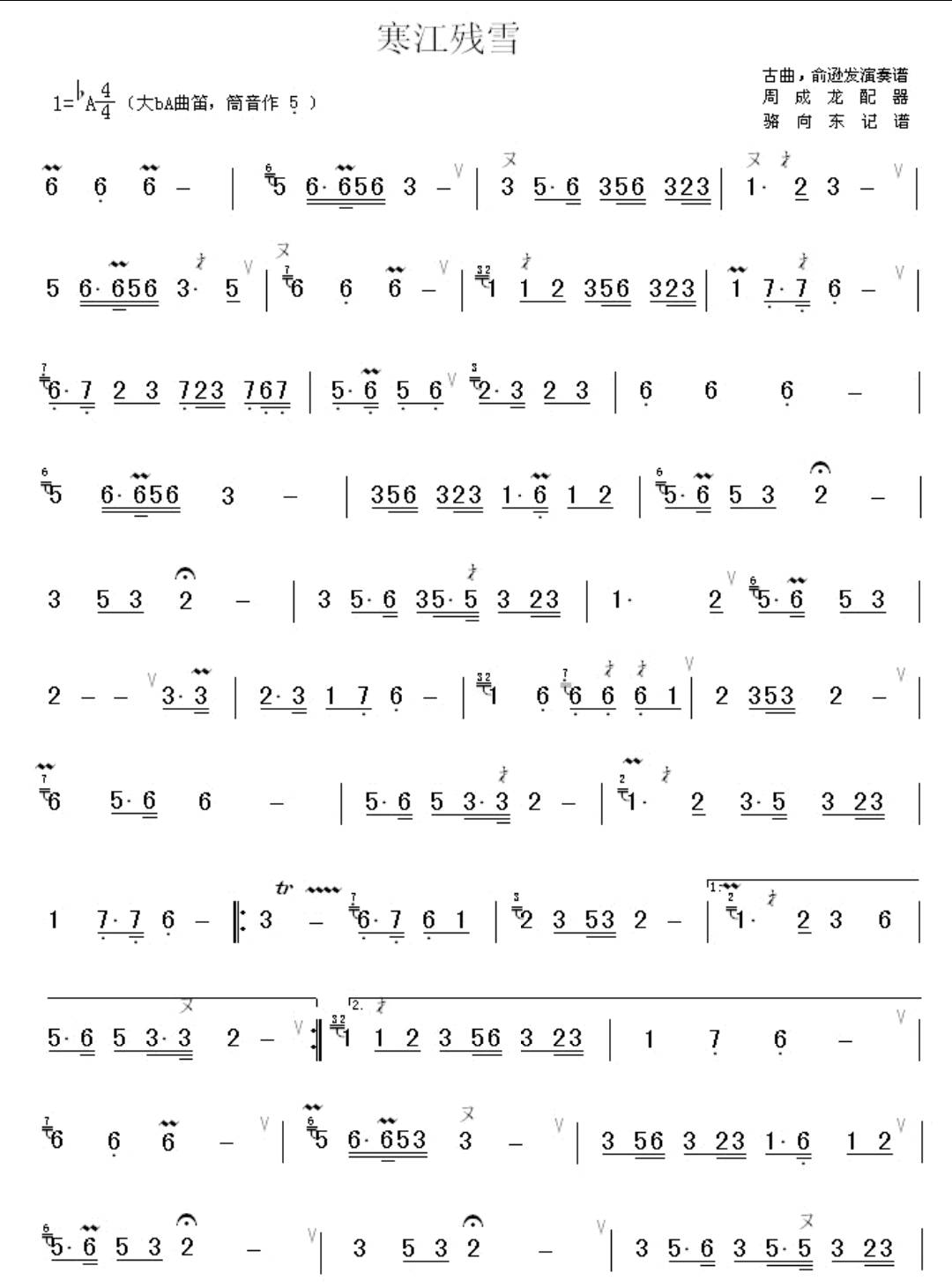 此曲亦名“春思”。乐曲宛转细腻,表现了一幅初春寂静的江南映射着皓皓白雪,残冬将去,春即来的景象。隔了门窗儿,幽幽的花香漫漫飘过来,幽幽地听到游丝般的笛音,在沉寂的夜空绕来绕去,那便是《寒江残雪》了。