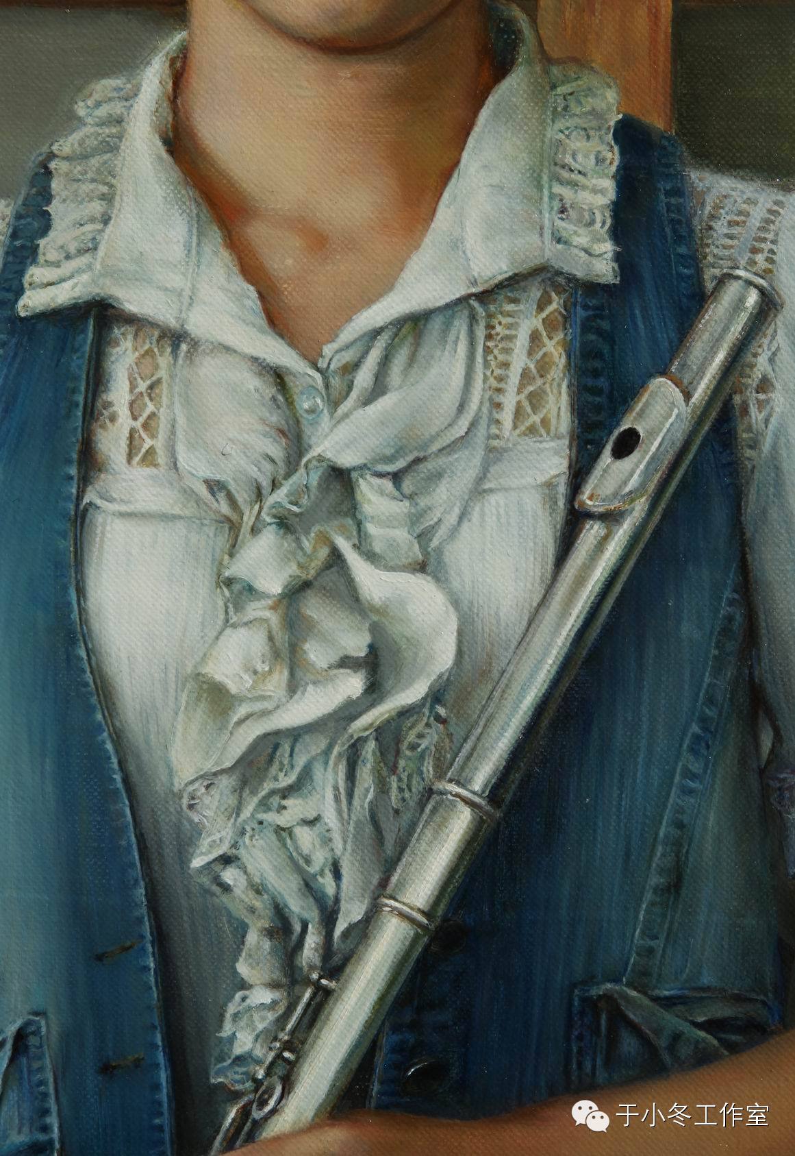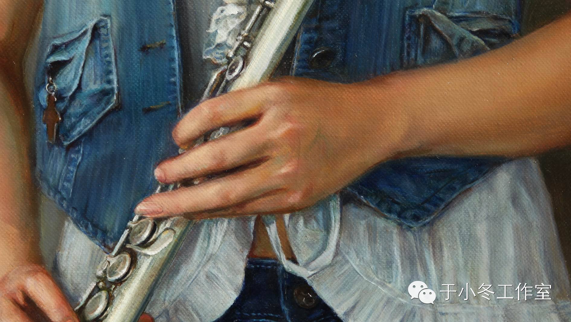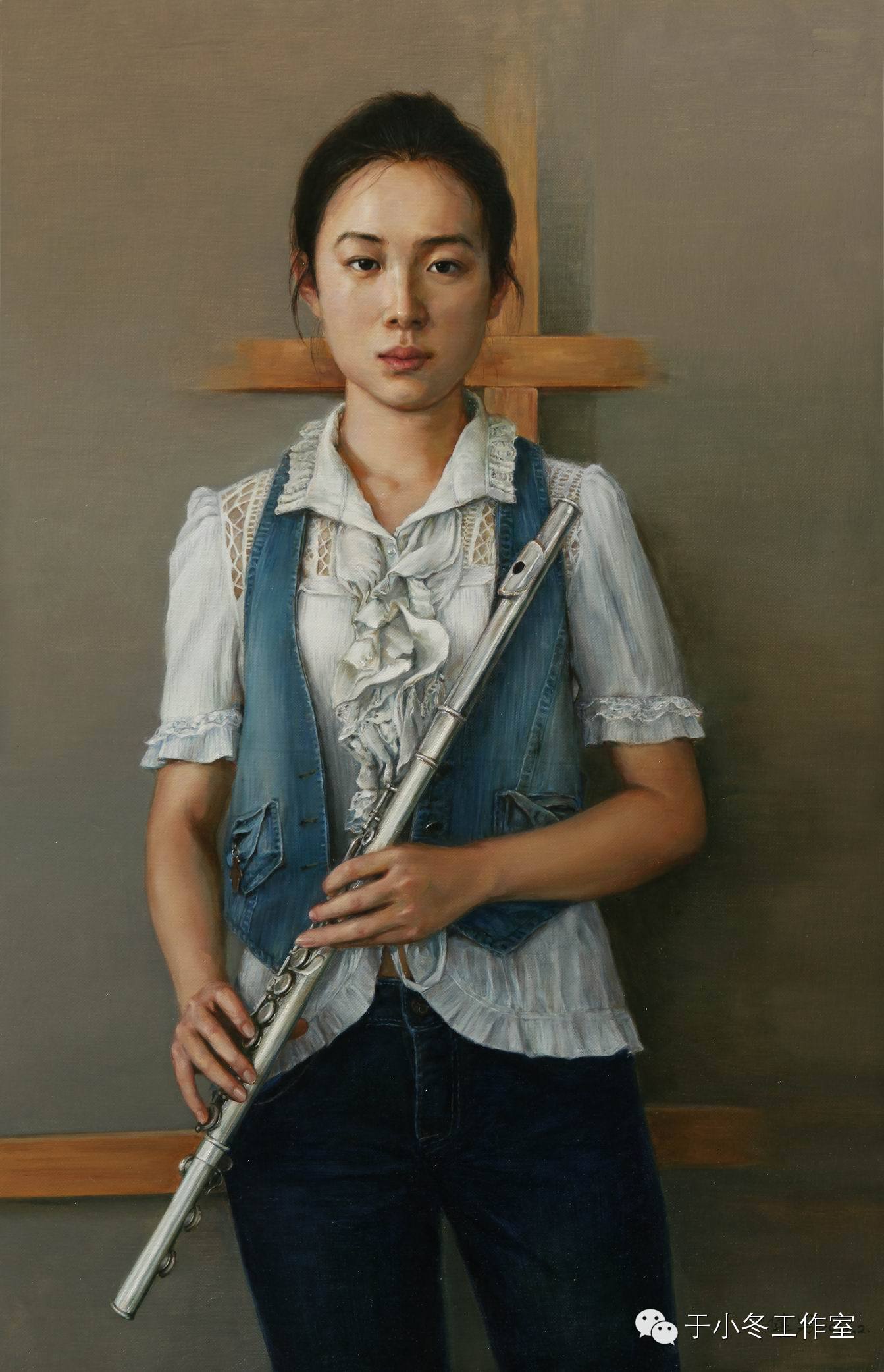 持长笛的女孩是我青春题材系列油画创作的延续,也是我现实主义表现方式的继续探索。人物的原型是一位艺术学院的研究生,身着牛仔便装,手持着演奏用的长笛若有所思。同以往的作品人物手持画笔、魔方一样,都是对青年对人生追求及命运的憧憬与追寻。身后的木框将画面进行黄金比例的分割,增加画面层次和些许神秘。女孩清秀的面庞与纯净的双眸,和带有个性的形象也是我不断追求的真实存在感。整个画面的色调清雅,虽然着力于写实,其实在用笔上注重轻快与飘逸,预制肌理的把握上,色层扫、揉相结合以表达不同的质感。既注重全局观,体现着坚实的写实探索,又在笔法上透着松动的尝试。