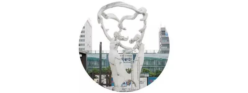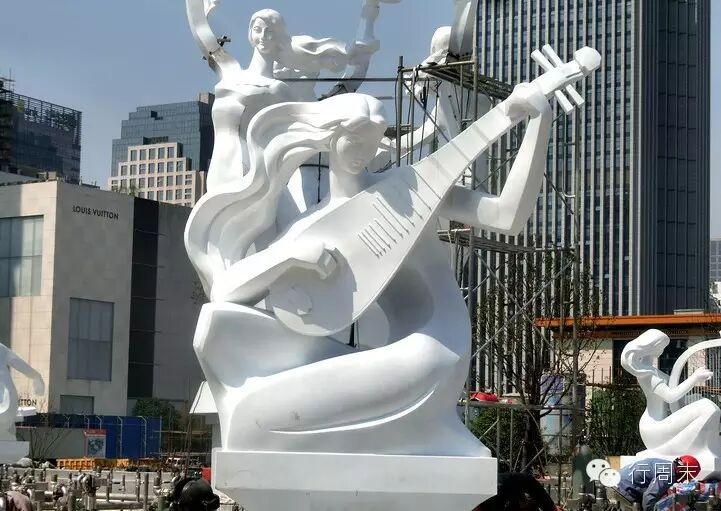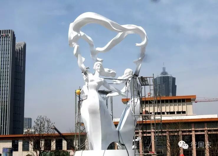 雕塑里的八位“少女”中间三位舞蹈,手舞丝绸