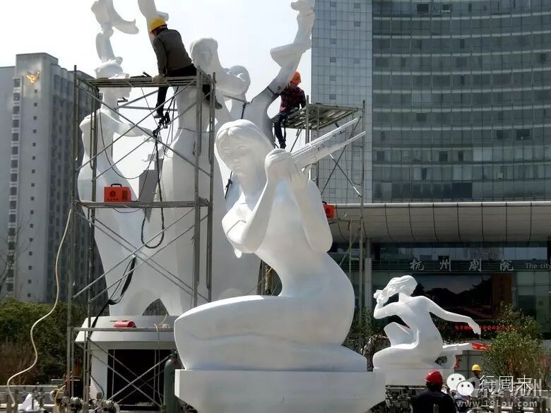 工人们把水泥雕塑表面罩上了玻璃钢模块