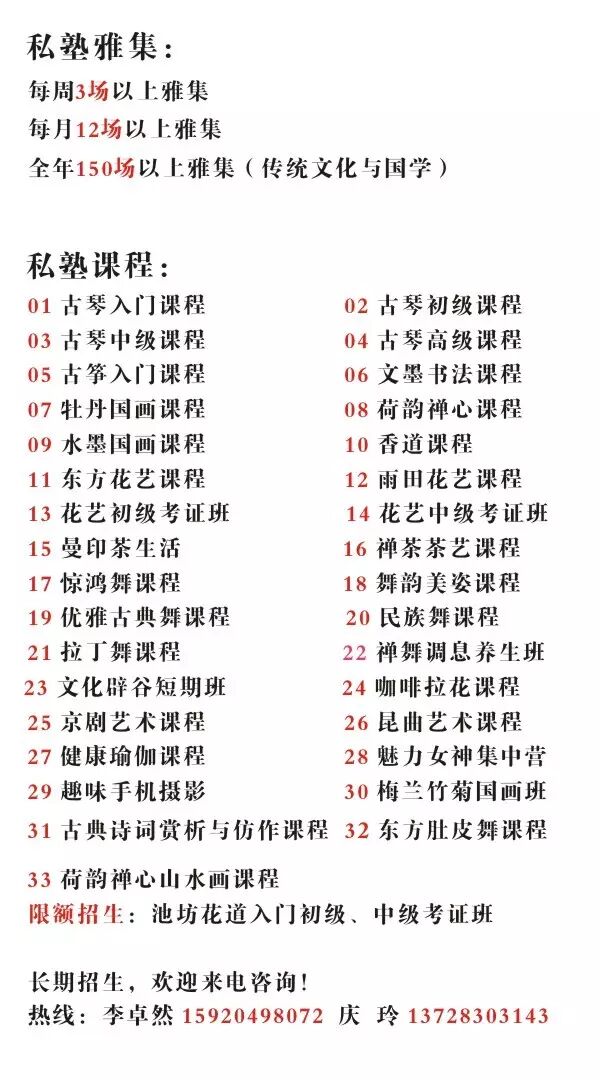 私塾所有课程可为个人提供个性化、一对一的文化课程定制服务。私塾为机关、团体,单位提供高端文化雅集和文化培训课程定制服务,承办、策划各类文化庆典活动,是各大企事业单位、金融机构等文化定制服务的首选合作伙伴。