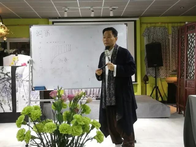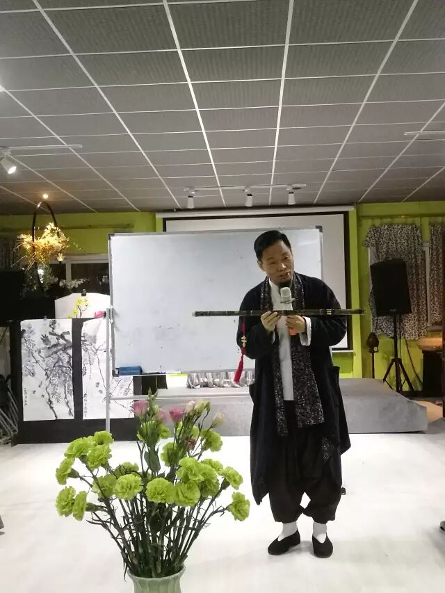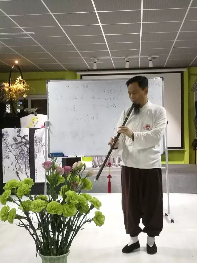 胡子老师身着汉服,手执洞箫,谈吐间不时地捋下那一缕大胡子,