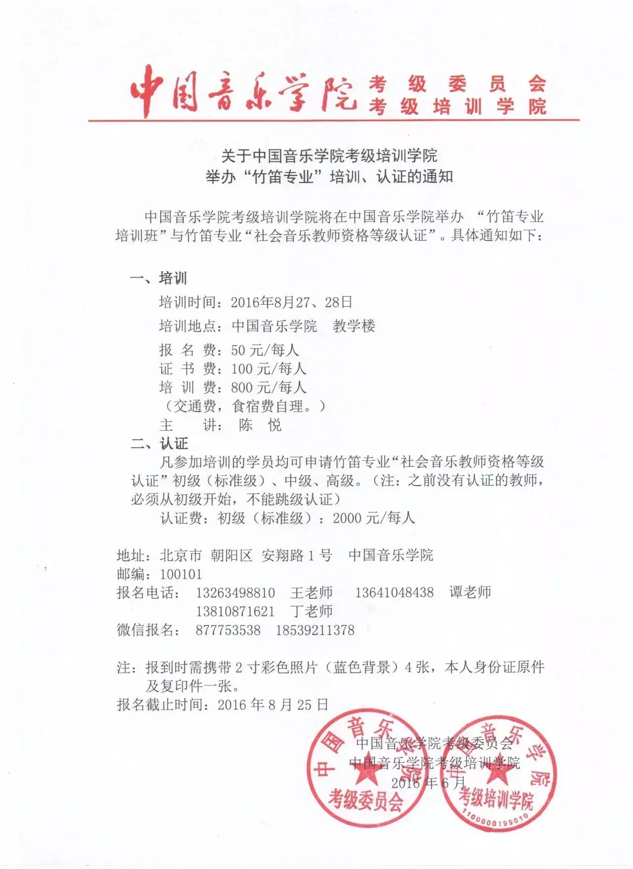关于中国音乐学院考级培训学院将在中国音乐学院举办 “竹笛专业培训班”与竹笛专业“社会音乐教师资格等级认证”活动说明。