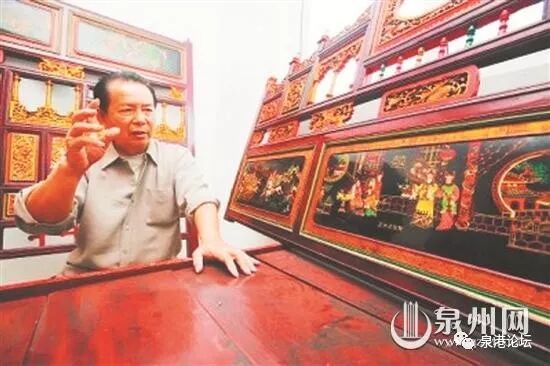 据刘老介绍,眠床的雕工和制作十分讲究,画着各种神话传说、戏剧人物、花果鸟兽、山水风景,都是人们喜闻乐见的东西。眠床的规制也有讲究,有7堵(闽南语音译,指眠床构件)、11堵和24堵的,图案也不一样,24堵已是极其讲究“排场”的了。当时闽南地区看谁家富裕,就是看他家制作的眠床有多少堵。也因此,漆画工在当时是受人尊重的职业,人们看见这样的老艺人,都要好吃好喝地招待。