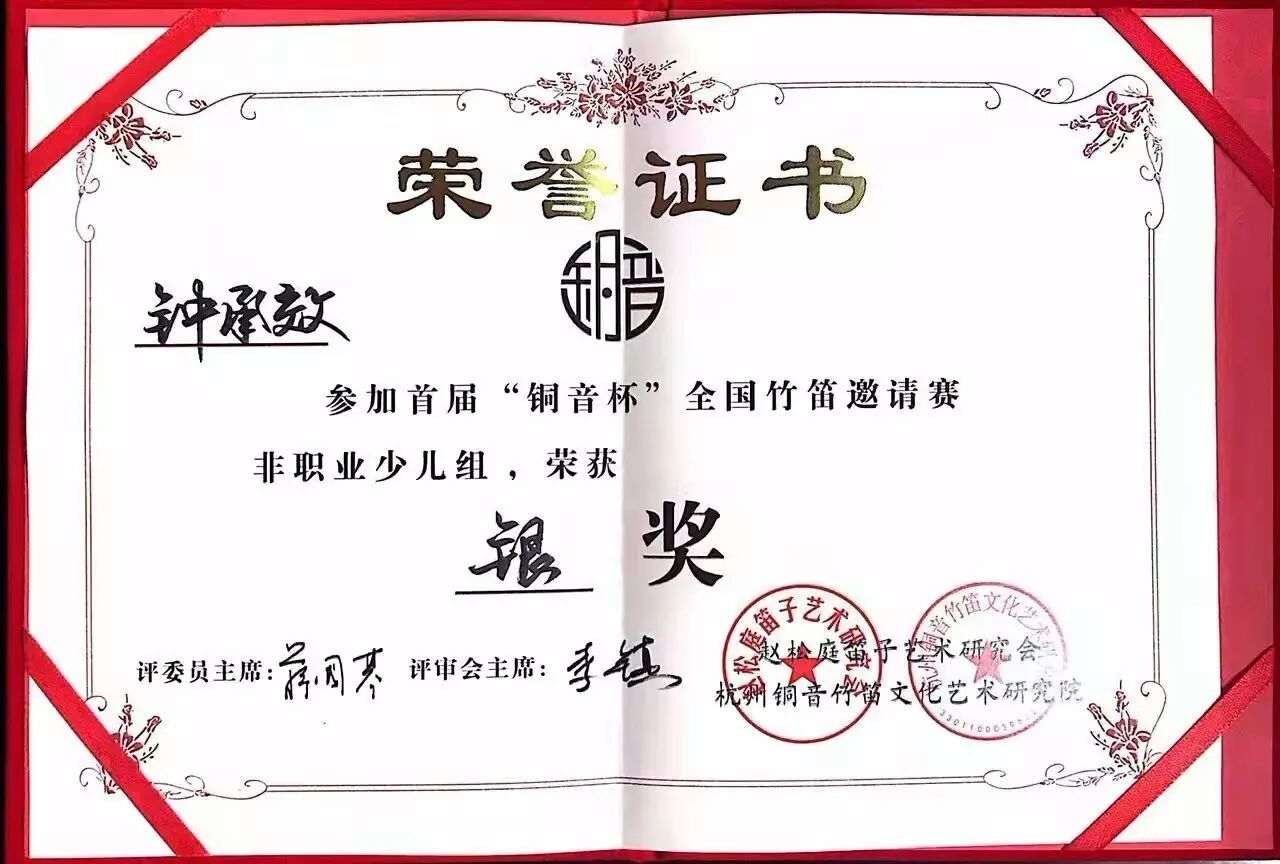 7月9日,我宫8名竹笛学员参加了第十五届中国优秀特长生艺术节浙江赛区的竹笛比赛,通过选手、家长及我宫辅导老师的共同努力下,本次获得了特金奖1名、金奖3名、银奖4名的优异成绩。同时,两位辅导教师获得了“优秀指导教师”荣誉称号。其中,特等奖获得者钟承效同学在8月6日参加的首届“铜音杯”全国竹笛邀请赛中,获得非职业少儿组银奖。特此祝贺!