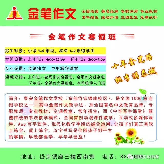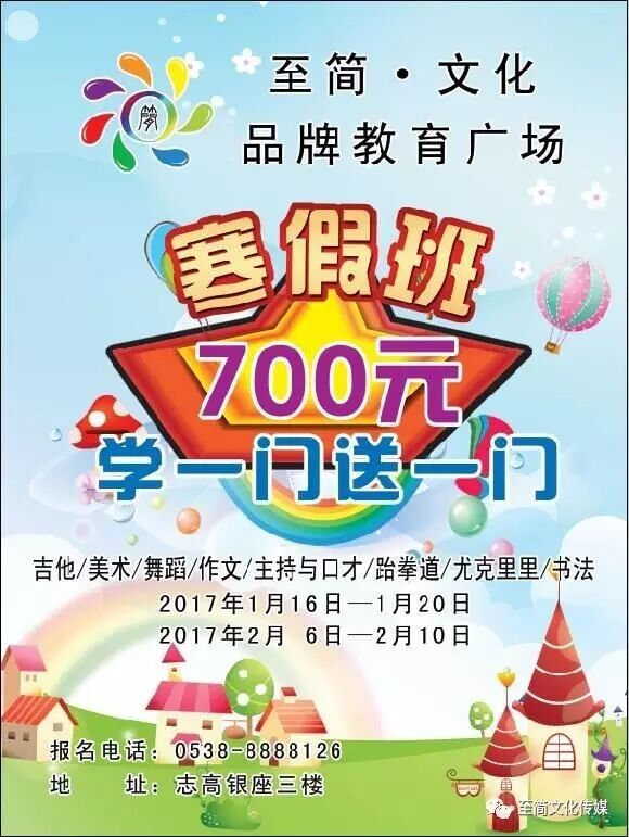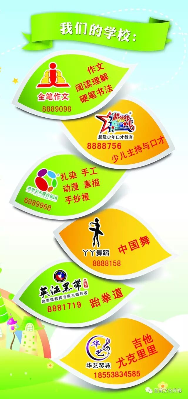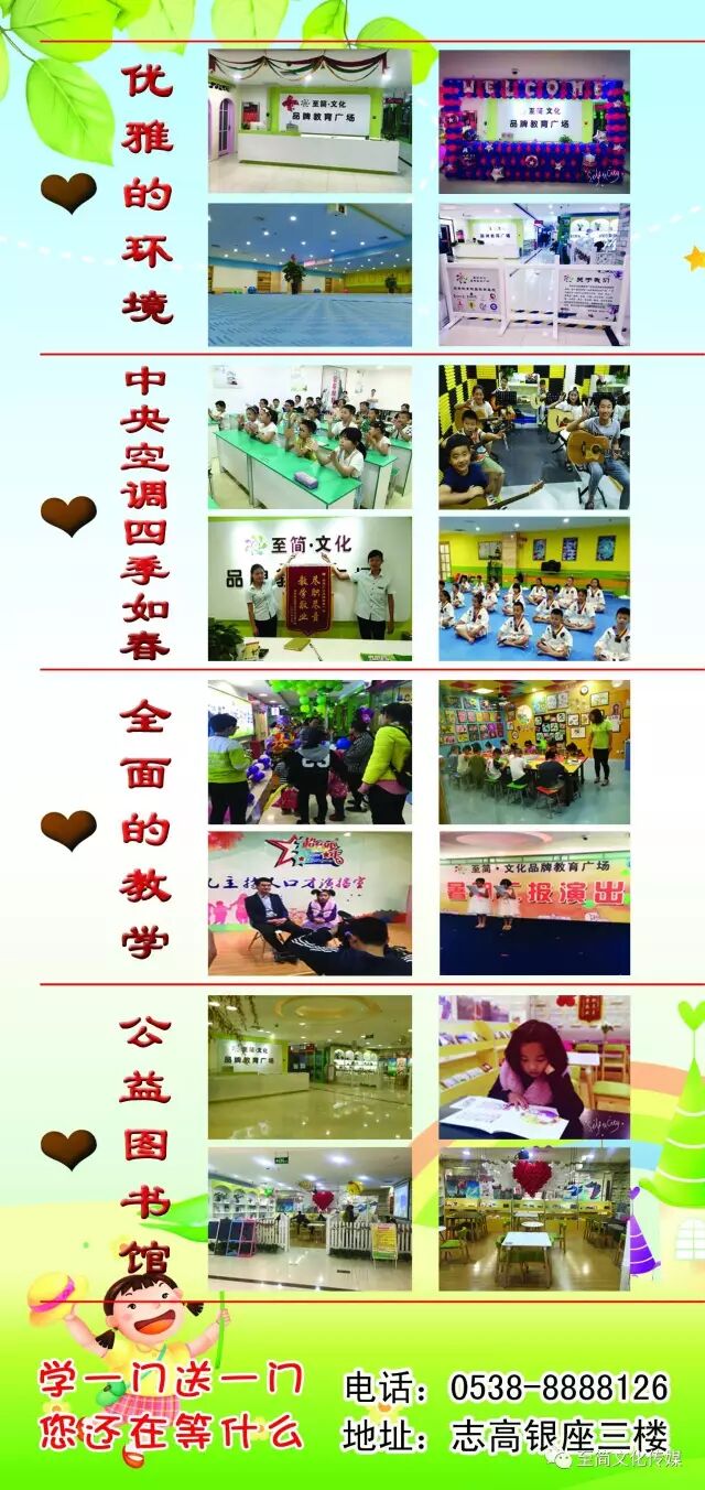 至简文化品牌教育广场作为泰安市首家一站式教育服务广场,面向3--18岁少儿开设了作文,钢琴,小提琴,萨克斯,古筝,吉他,尤克里里,非洲手鼓,二胡,舞蹈,跆拳道,美术,书法,幼少儿口才等全方位的课外教育。目前已入驻英涵黑带跆拳道、超级少年口才教育、丫丫舞蹈、希望美术、金笔作文、陈阳音乐工作室、华艺琴苑等多家品牌学校哦!另外还配备了图书馆,公共自习室,家长课堂等服务区。优雅的环境,一流的教学质量,贴心的服务,是您给孩子最好的选择!