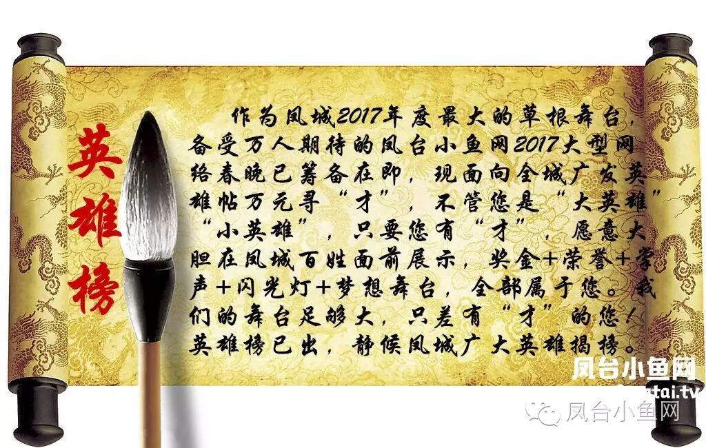 作为凤城2017年度最大的草根舞台,,现面向全城广发英雄帖万元寻“才”,不管您是“大英雄”“小英雄”,只要您有“才”,愿意大胆在凤城百姓面前展示,奖金+荣誉+掌声+闪光灯+梦想舞台,全部属于您。我们的舞台足够大,只差有“才”的您!英雄榜已出,静候凤城广大英雄揭榜。
